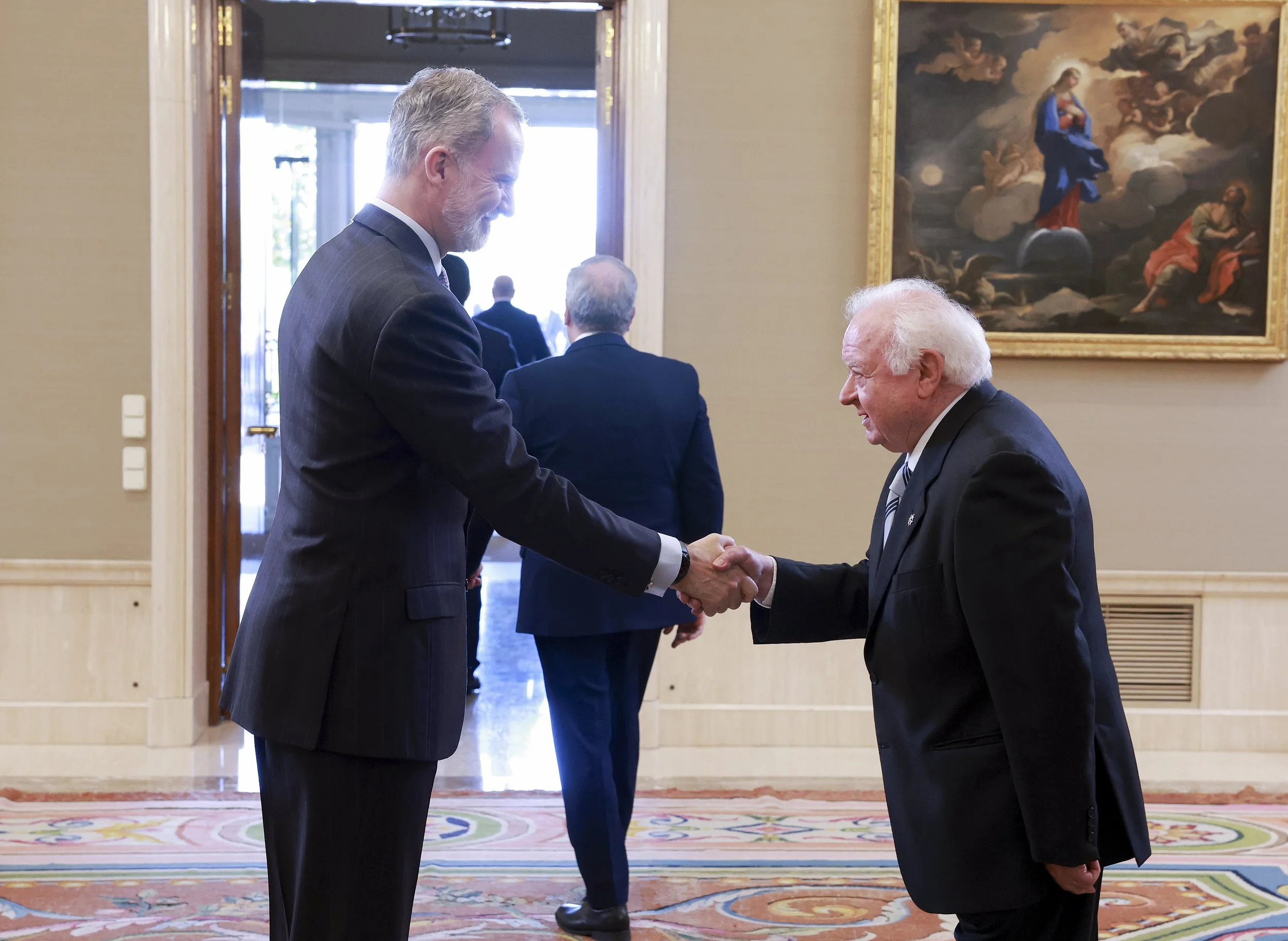 S.M. el Rey Felipe VI, en el Palacio de La Zarzuela, ha recibido en Audiencia a una representación del Consejo General de Graduados Sociales, formado por su presidente Joaquín Merchán Bermejo, los vicepresidentes 1º y 2º, Juan Fernández Henares y Marcos Martínez, respectivamente, la directora de la Fundación Justicia Social, Eva Torrecilla Hernández, así como diferentes presidentes de los colegios de España y colegiados, con motivo de la celebración del Centenario de esta profesión.